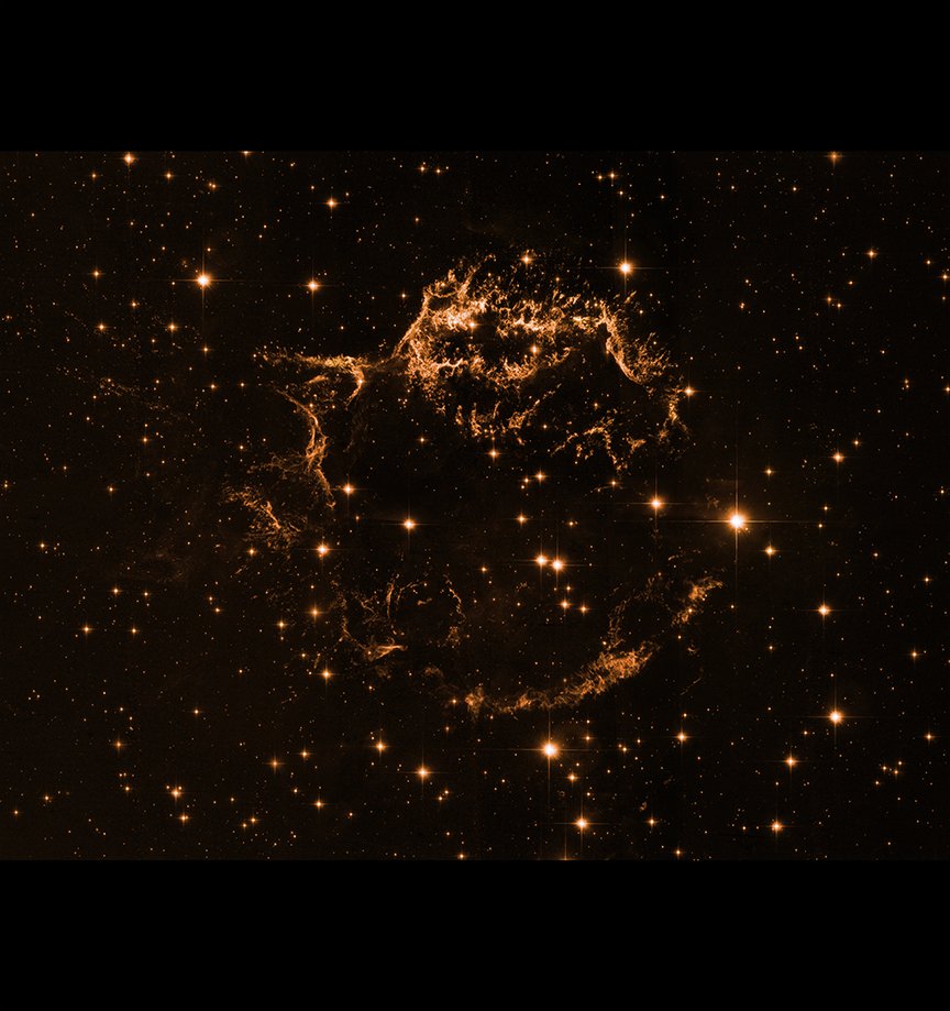 El telescopio espacial Hubble, también ha capturado a Cassiopeia A. Los datos del Hubble combinados con los datos provenientes del Chandra, se muestran en color naranja. Y la segunda imagen muestra solo los datos capturados por el Hubble. Ambas imágenes muestran toda la gran y compleja estructura de los fragmentos que explotaron de la estrella.
