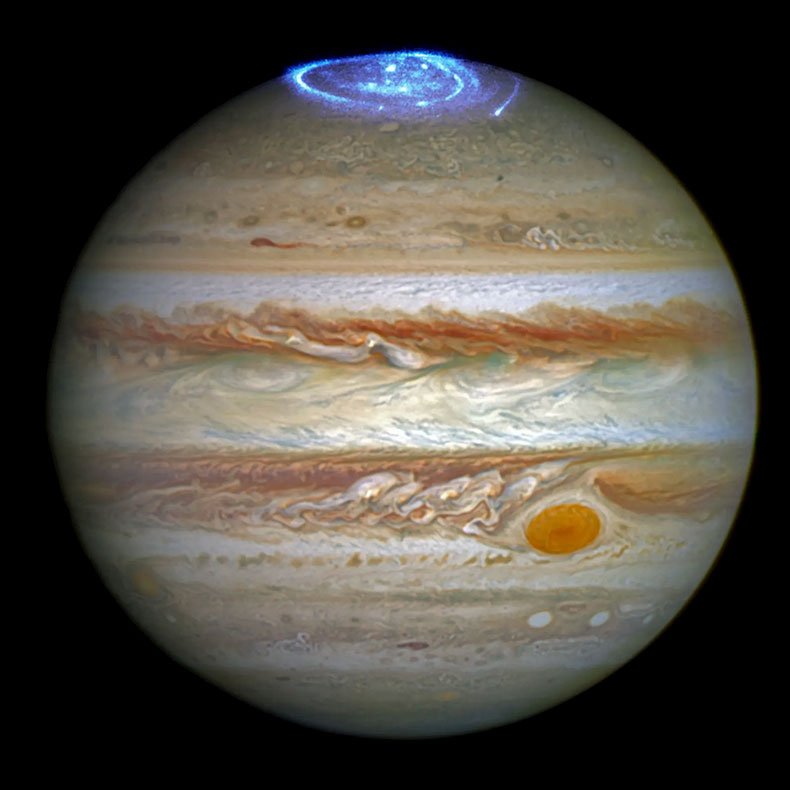 Júpiter: el gigante gaseoso, con una atmósfera turbulenta y la Gran Mancha Roja, una tormenta más grande que la Tierra que persiste desde hace siglos.Tiene más de 80 lunas, como Europa, con posible océano interno.